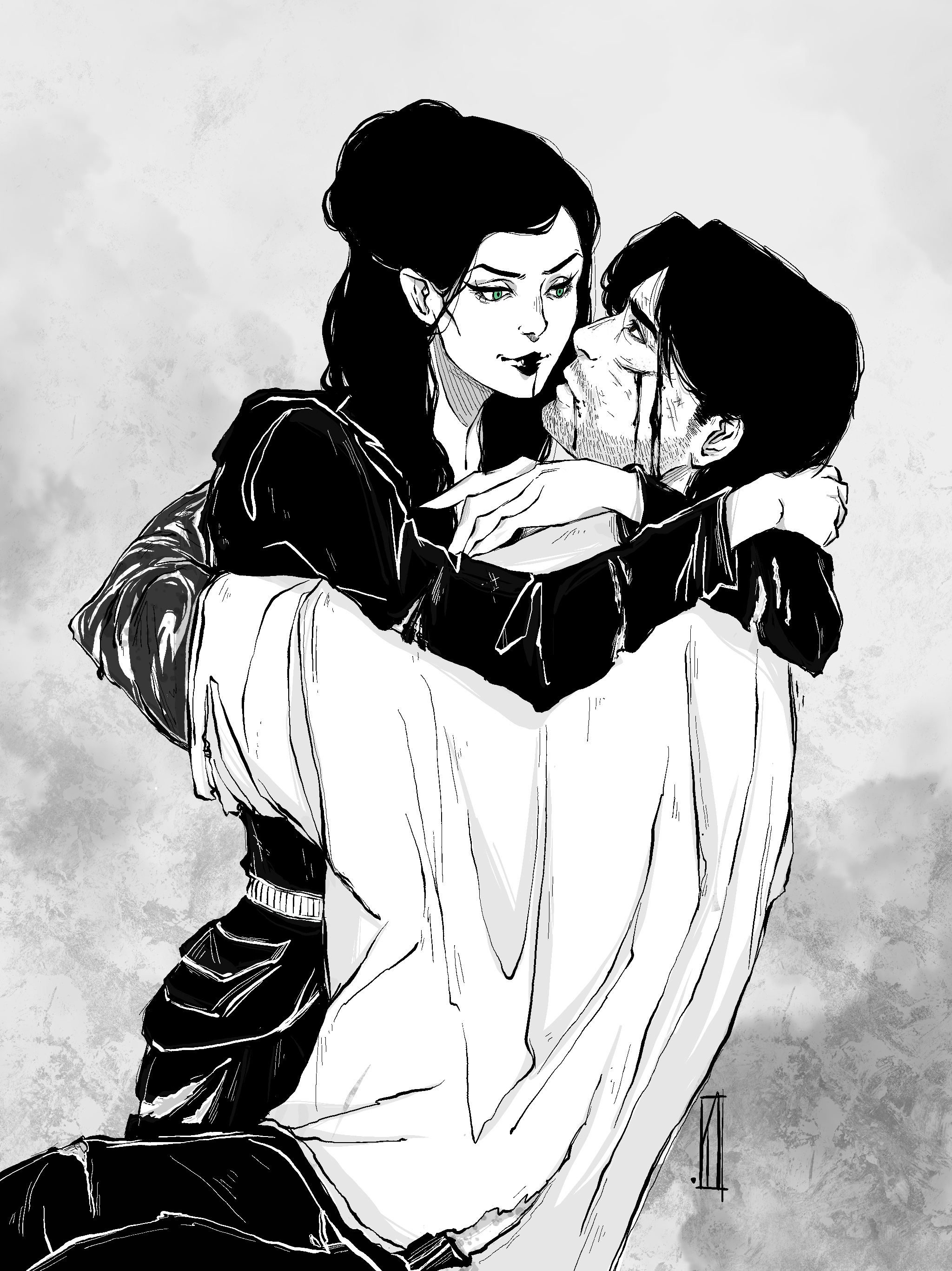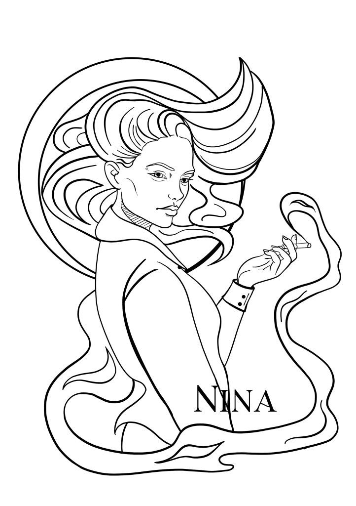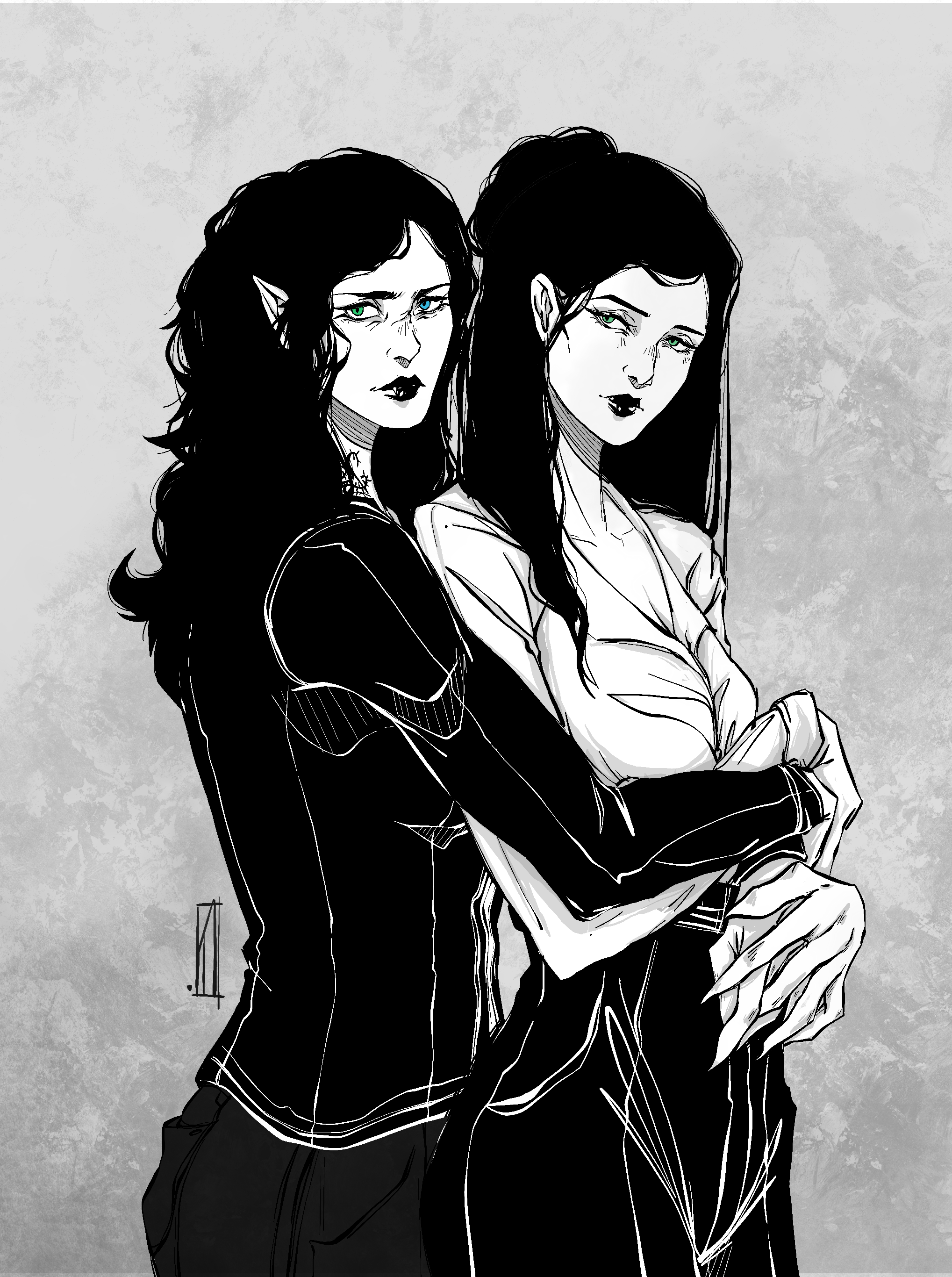 Le style de Kloh.eh colle tellement bien à la saga, ça aurait été un crime de ne pas lui commander des illustrations ! Et cette fois, j’ai demandé des duos de personnages. Vous pouvez donc découvrir deux scènes tirées de la saga. Une avec Nina et Jim, l’autre avec Nina et Imra.
